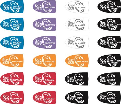 A nominal set of PED Keys, as purchased with a SafeNet HSM with PED (Trusted Path) Authentication, consists of ten black USB-token PED Keys, along with colored stickers to identify them (several each of blue, red, black, orange, white, and purple), which allows some spares or backups. The PED Keys are completely interchangeable before they are imprinted by your action. The PED Keys are imprinted by the PED during HSM initialization and Partition creation, so at a minimum you would have one each of :