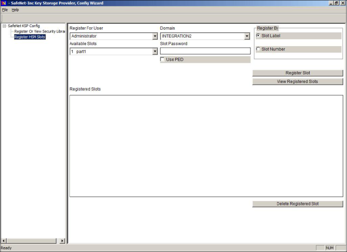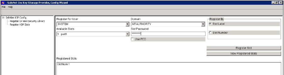 After installing KSP, use the KSP configuration wizard to register your HSM Partitions for use with CNG. The KSP configuration tool secures the Password for each HSM Partition such that only the user for which the Password was secured is able to un-secure it.