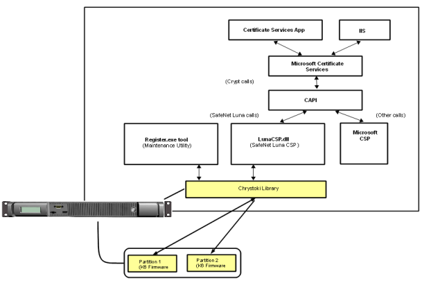 Note, in the diagram, that the SafeNet Luna CSP routes relevant calls through the statically linked Crystoki library to the HSM via CP calls. Other calls from the application layer – those not directed at the token/HSM, and not matching the Luna CSP supported functions (see next section) – are passed to the Microsoft CSP.
