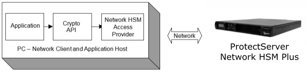 In network mode, access provider software is installed on the machine hosting the cryptographic API software. The access provider allows communication between the API and the SafeNet ProtectServer Network HSM Plus over a TCP/IP connection. The HSM can therefore be located remotely, improving the security of cryptographic key data