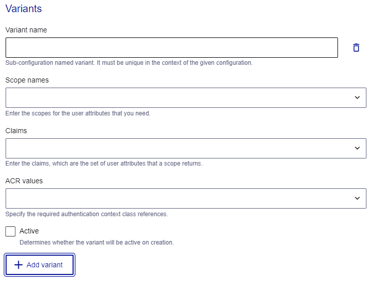 You must add at least one variant. Variants allow you to send different authentication requests, with different scopes, claims, and ACR values, to an IDP.