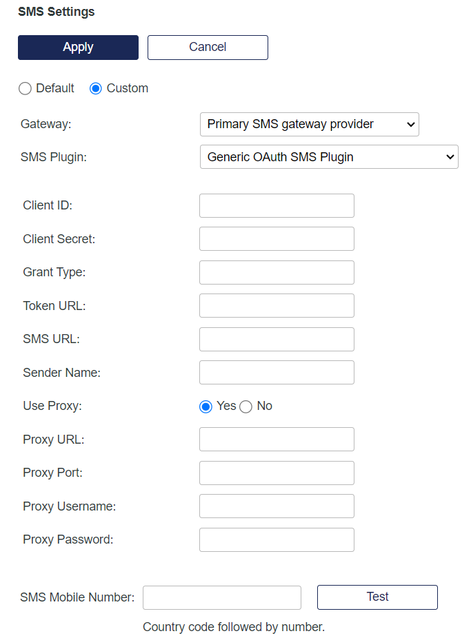 Use Proxy: If you will be sending SMS messages via a proxy server, select Yes, and then add the Proxy URL, Proxy Port, Proxy Username, and Proxy Password.