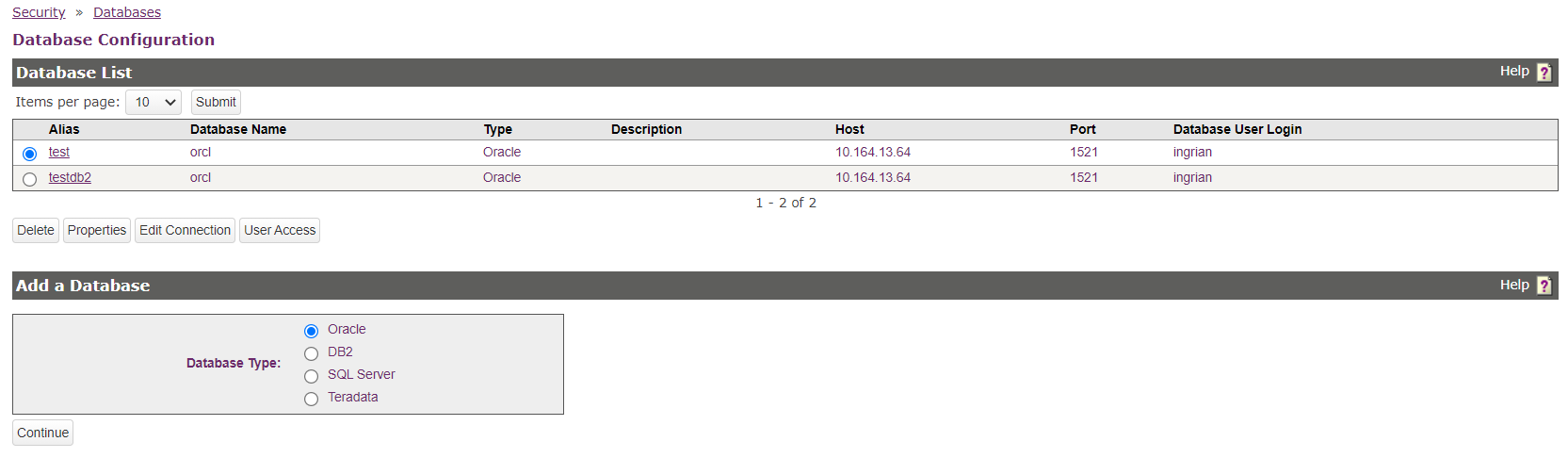 The Database Configuration screen shows existing database connections and database types.