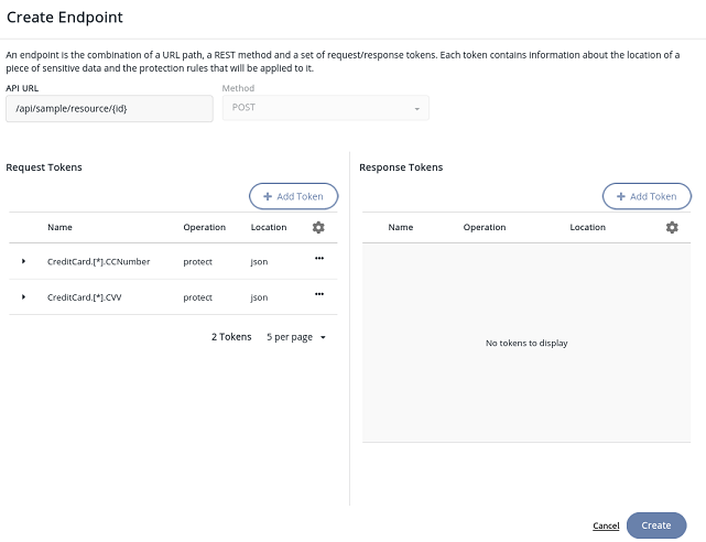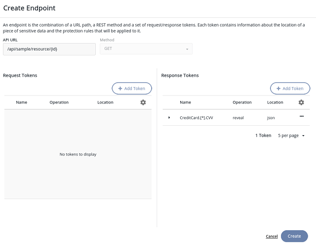 — RevealProtection Policy Select the protection policy form the drop-down list. If protection policy doesn't exist, click Add Protection Policy and click Select. Refer to Managing Protection Polices for details. External Version Header Specify the name of the parameter that will store the version header details (type, protection policy version, and key version). This parameter appears on the UI only when the selected protection policy uses external version header. Access Policy This parameter appears on the UI if operation type is Reveal. Select the access policy from the drop-down list. If access policy doesn't exist, click Add Access Policy and click Select. Refer to Managing Access Policies for details. If the JSON body has an array of objects, specify the sensitive tokens in the format shown in the below example: