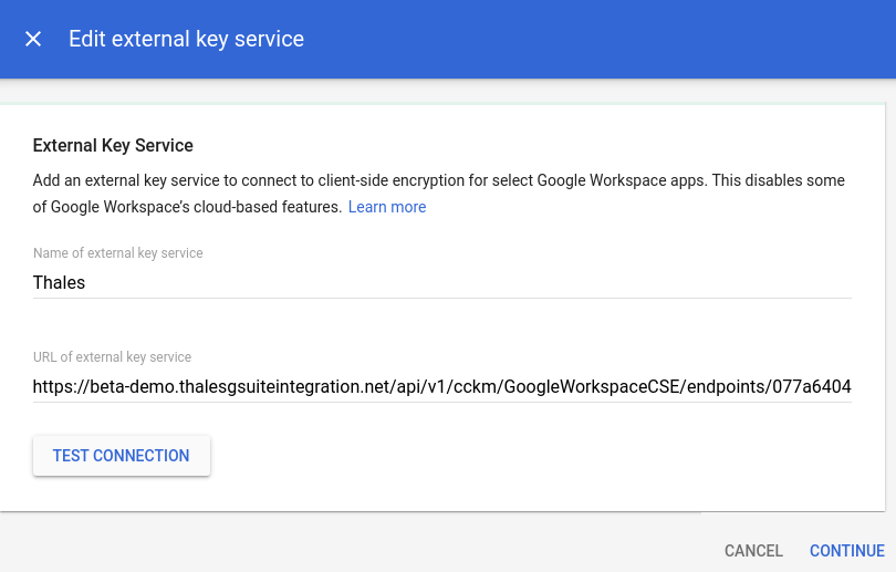 Users will be given an Endpoint URL to access our key service (KACLS). The users will need this URL to configure Google Workspace to contact KACLS (CipherTrust Manager).
