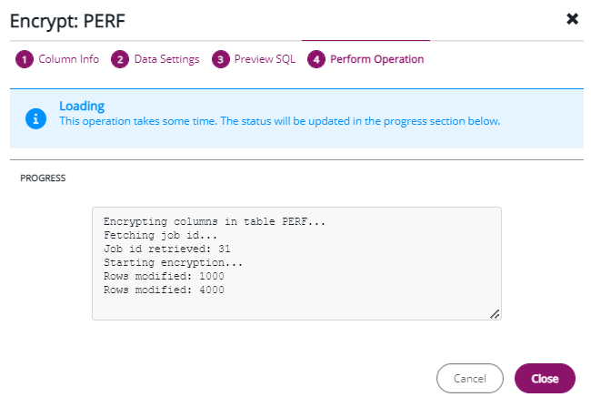 The Perform Operation screen shows the progress of the operation. A message The column encrypted successfully. Close the window to return to the list is displayed on the screen. Click Close to exit the wizard.