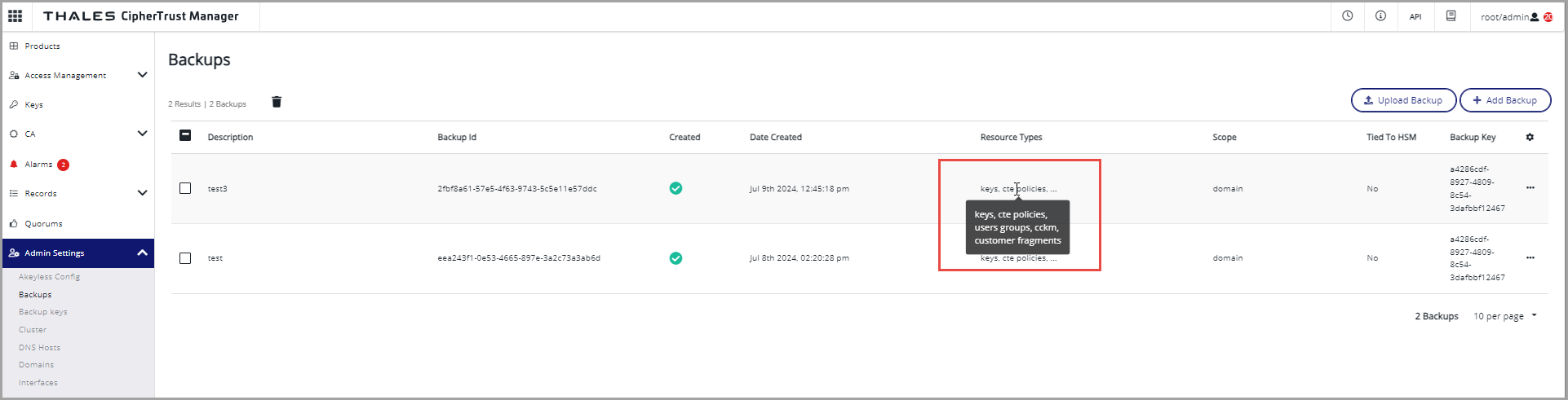 CipherTrust Manager supports system backups and domain scoped backups.