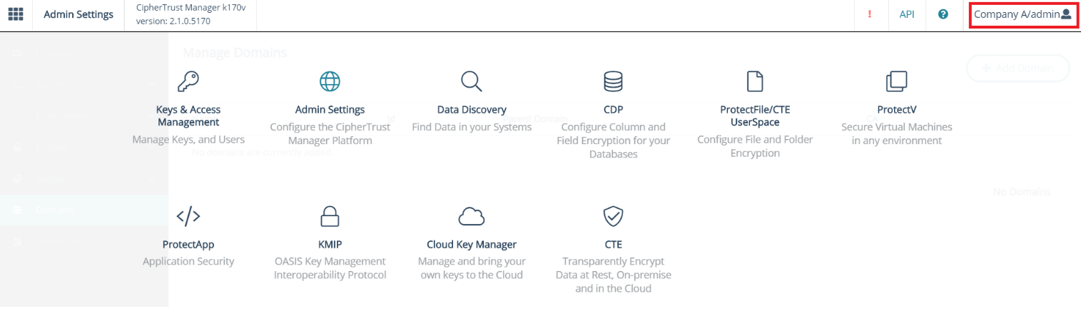 Log into the CipherTrust Manager Management Console as an Admin with domain creation permissions.