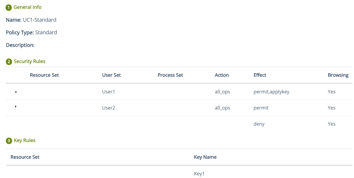 After the data is migrated, unguard the data transformation policy, apply the standard policy with same key (as used by the data transformation policy). A sample standard policy applied after unguarding a transformation policy is shown below: