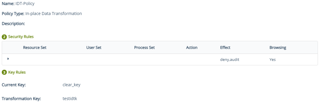 After the data is migrated, unguard the data transformation policy, apply the standard policy with same key (as used by the data transformation policy). A sample standard policy applied after unguarding a data transformation policy is shown below: