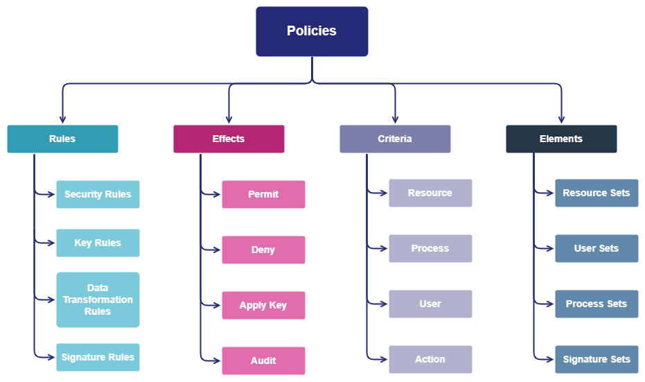 A policy is a collection of rules that govern data access and encryption. Think of a policy as an if-then statement. Policy rules are processed sequentially. If the criteria of rule one are not met, the policy enforcement engine moves on to the second rule and so on.