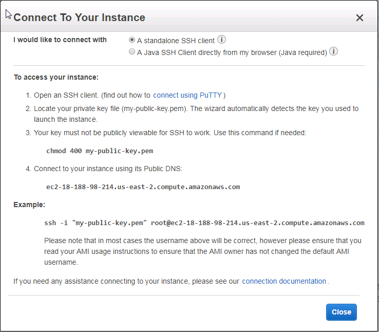 If you are unable to connect to your instance using PuTTY, go to: https://docs.aws.amazon.com/AWSEC2/latest/UserGuide/putty.html for further assistance.