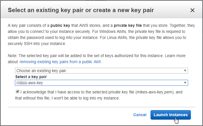 After selecting the Key Pair, check off the acknowledge statement at the bottom of the dialog box, confirming that you have access to the selected private key file.