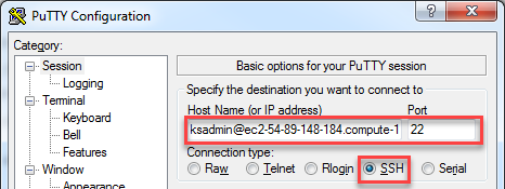 Paste the Public DNS in the Host Name (or IP address) field and preface this string with "ksadmin@".
