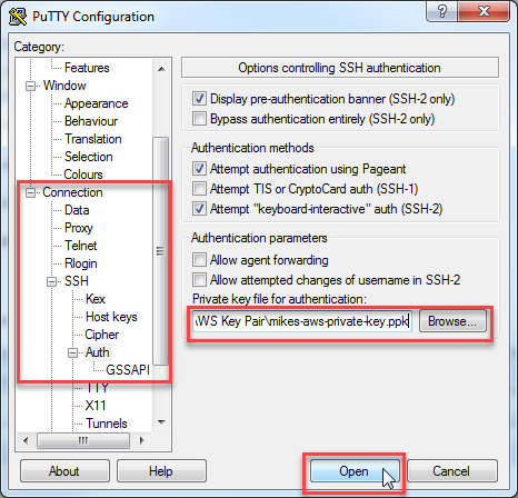 Select your Public Key file name. The file name and path is automatically places in the Private key file for authentication field.