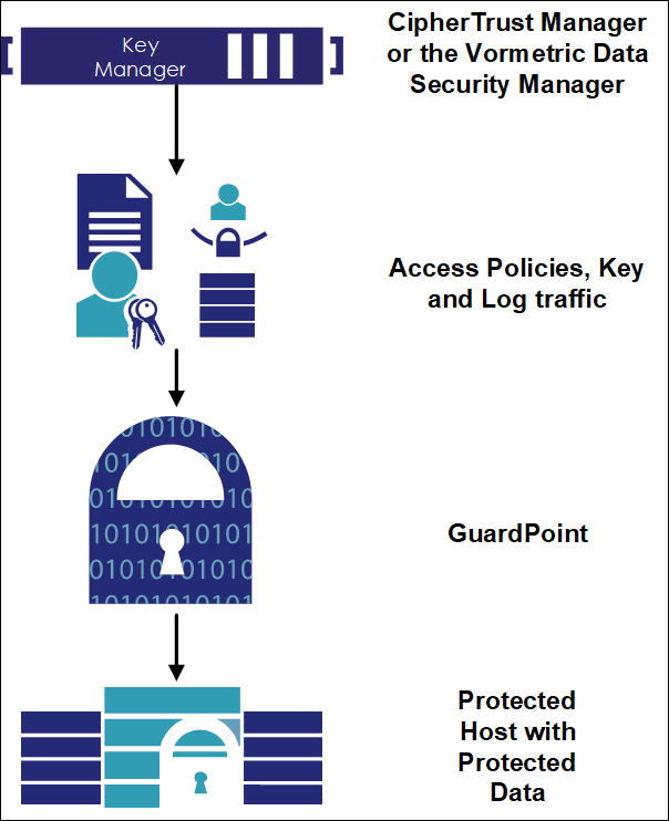 A GuardPoint is usually associated with a Linux/AIX mount point or a Windows volume, but it may also be associated with a directory sub-tree.The CTE Agent sits between applications and the file system that hosts files within the GuardPoint. The CTE Agent intercepts every file access request and enforces the access and encryption rules in the policy associated with the GuardPoint.