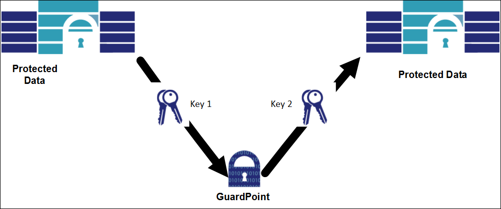 In the following figure, already-encrypted files protected by a CTE GuardPoint are rekeyed by copying them to a directory protected by another GuardPoint with a different encryption key. Both decryption and re-encryption are transparent to copy utilities.