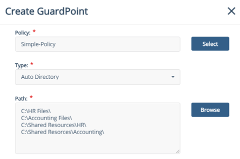 In the Path field, enter the directories you want to protect with this policy or click Browse to select them from a explorer window.