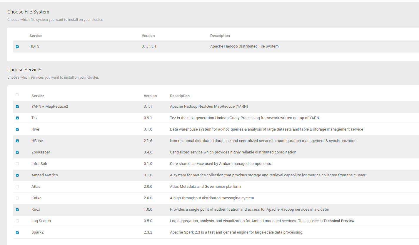 In the list shown in the GUI, we only need to select those. In the next step, we'll add PQS and Livy to the cluster.