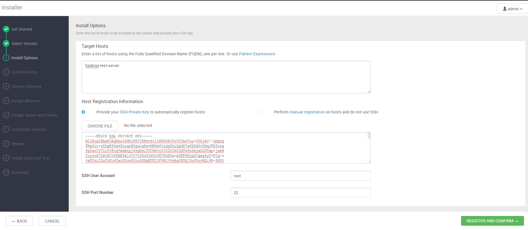 In this screen the hosts are configured. Put the hostname and private key of all nodes that will be on your cluster. The private key is the one that you saved in the step Configure Ambari.