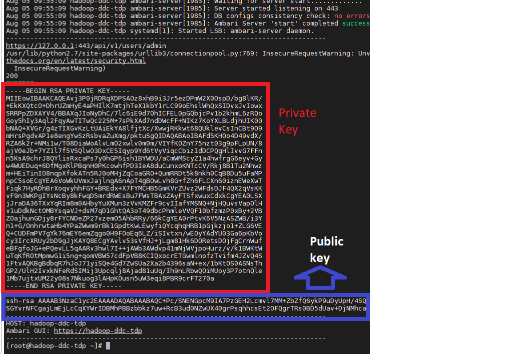 When this script finishes, it shows you the private key that has been set up for the node. Please save the key. You will need it for setting up the Ambari server private key.