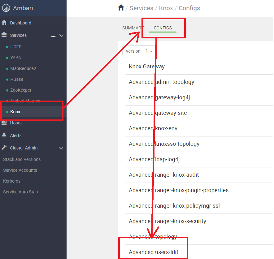 In the Ambari toolbar on the left, click to expand Services, then click Knox.