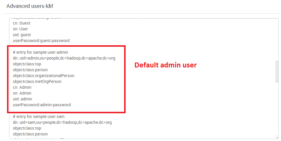 Scroll down to the #entry for sample user admin to find the userPassword, which by default is admin-password.