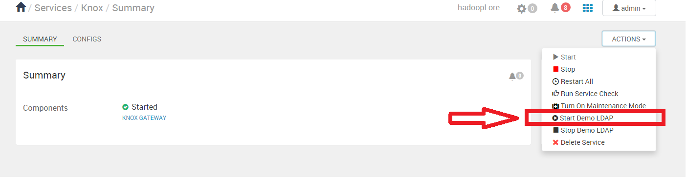 (applicable for demo purposes only) Go to the ACTIONS menu and click Start Demo LDAP. Without starting the demo LDAP you cannot use the Knox logins.