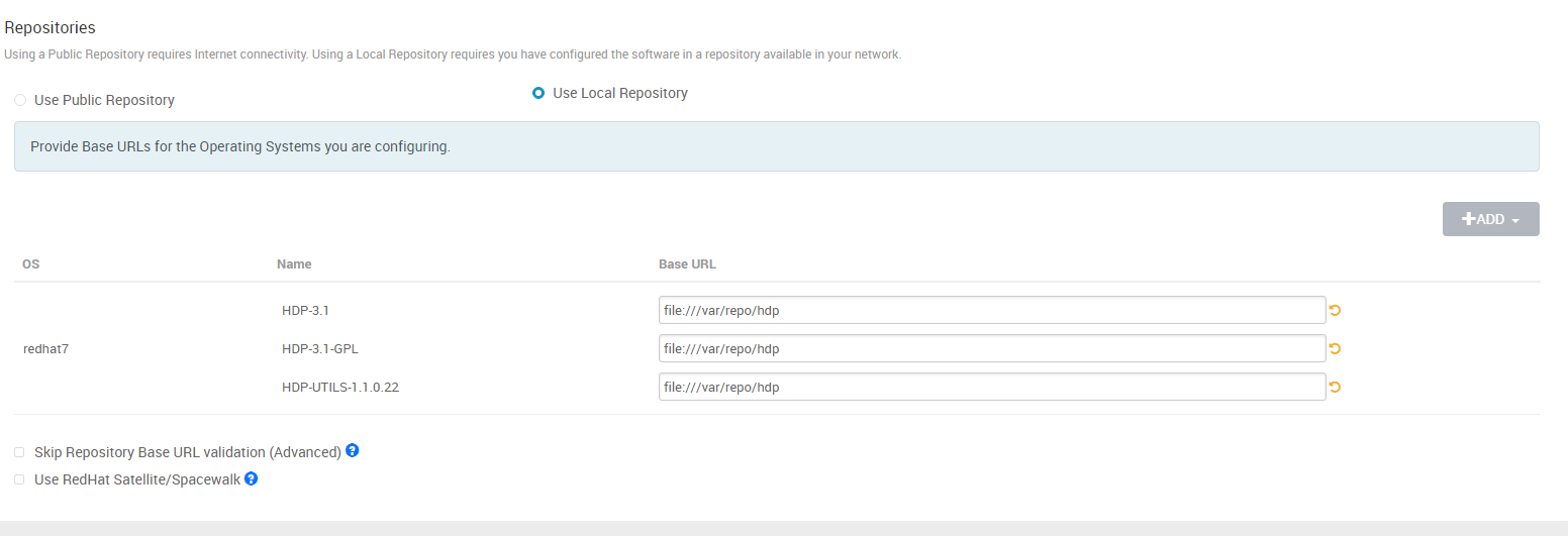 In the Repositories screen, make sure that you select the Use Local Repository option and fill in the Base URL fields per the screenshot above. The only needed OS in the Ambari configuration is Redhat 7, with the string file:///var/repo/hdp as value for the three paths. If you can see any other OS, you can remove it.