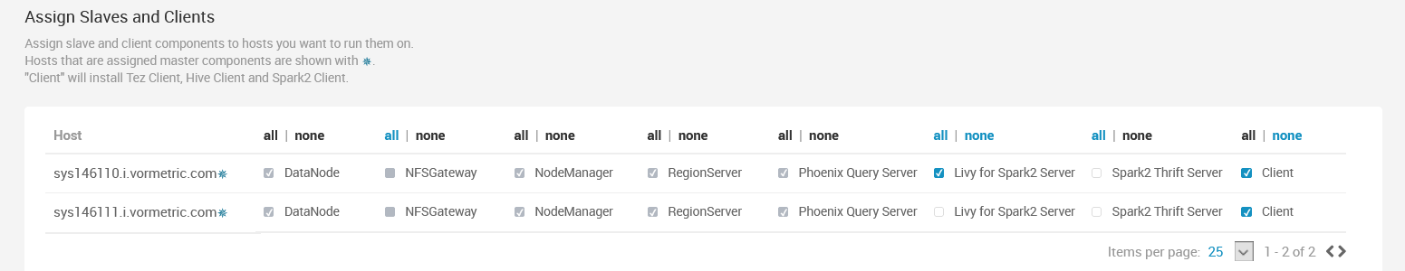 Select "Livy for Spark2 Server" in all nodes that you want this service running. You will need to remember which hosts you selected when you reach the "Update Livy configuration for Knox" step.