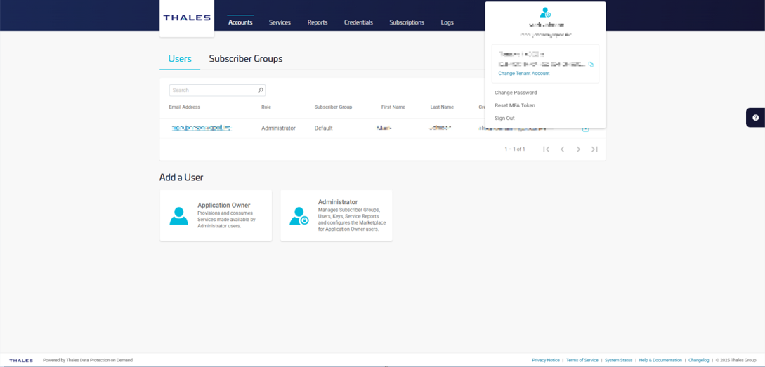 Click your user account email address in the upper right corner of the tenant user interface to display the user account management panel. The user account management panel includes the current tenant name and id.