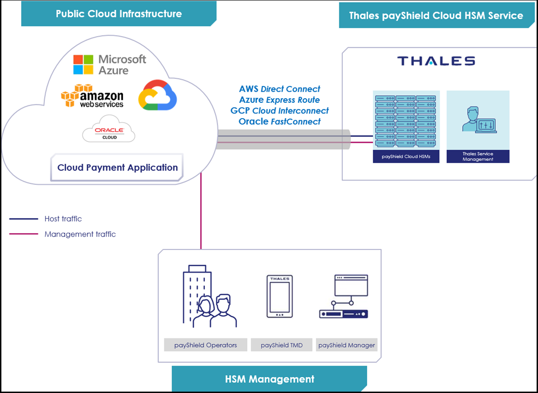 When the payShield cloud HSM variant is deployed, the separation of roles between the end user of the service (you) and the service provider (in this case Thales) differs from the on-prem configuration (where Thales is not directly involved). With the cloud HSM, the physical infrastructure is managed by Thales, and the HSMs are housed in datacenters under Thales control with high-speed links being available if required to connect to public clouds running the application workloads.