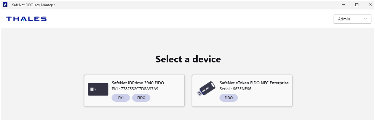 If multiple devices are connected, a list of the devices along with the modes (PKI or FIDO) is displayed.