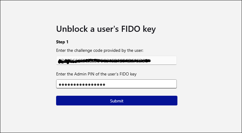 Enter the challenge code shared by the user and the admin PIN, and then, click Submit.