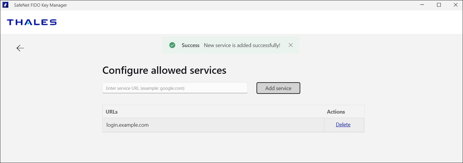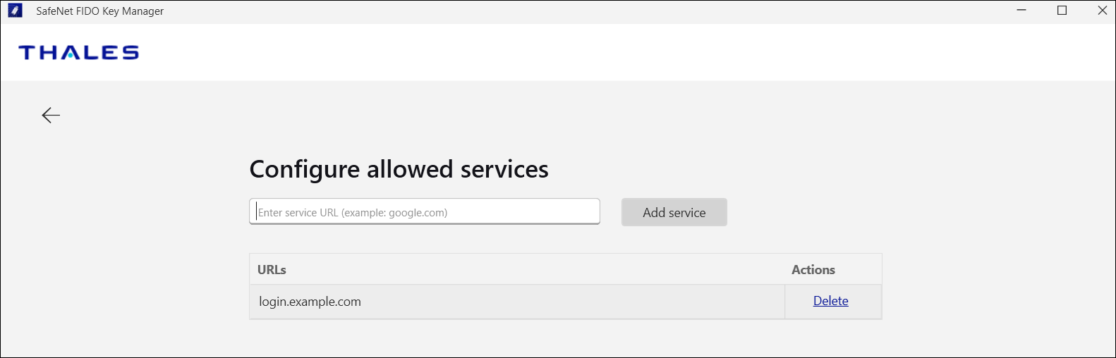You can include multiple services and identity providers (IDPs) URLs in the allowed service list on each FIDO device. Only the allowed service providers are permitted to take part in the authentication process. If the list is blank, all service providers are permitted.