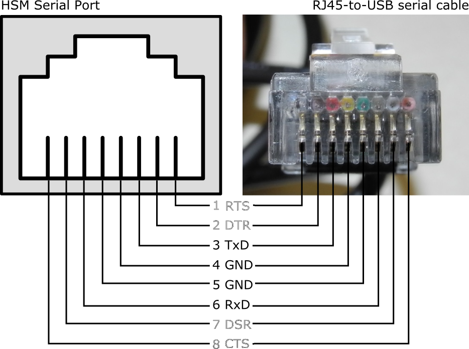 The Network HSM appliance serial port uses a configuration equivalent to the Cisco Terminal Console. The Prolific Technologies Inc. RJ45-to-USB serial adapter cable uses a standard RJ45 pinout configuration: