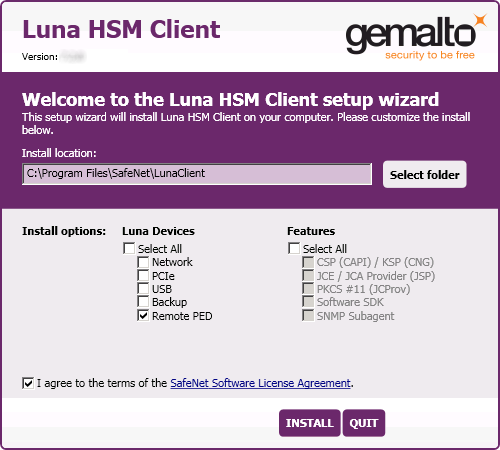 1.Run the Luna HSM Client installer and follow the on-screen instructions, as detailed in Luna HSM Client Software Installation, and select the Luna Remote PED option. Any additional installation choices are optional, for the purpose of this procedure.