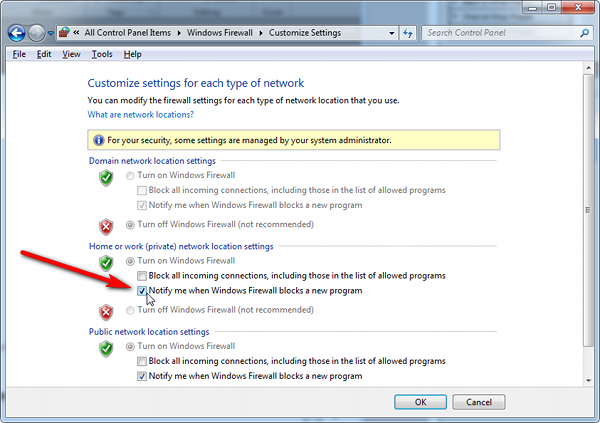 4.In the dialog Customize settings for each type of network, go to the appropriate section and activate Notify me when Windows Firewall blocks a new program.