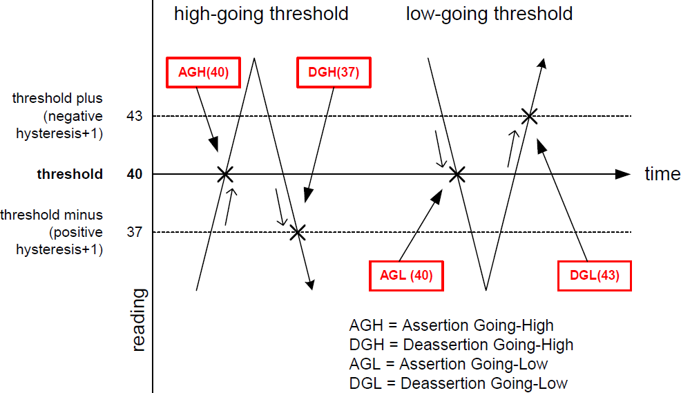 Combining the thresholds, hysteresis and state changes, IPMI has a means to create an event to describe what a sensor is doing. Event Assertion/Desertion Thresholds from the IPMI specification illustrates event assertion and desertion at different thresholds.