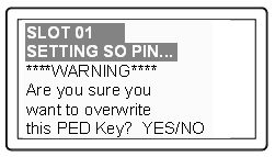 You can respond [ YES ] and present one or more blank keys, all of which will be imprinted with exact copies of the current PED Key's authentication, or you can say [ NO ], telling the PED to move on to the next part of the initialization sequence. (You should always have backups of your imprinted PED Keys, to guard against loss or damage.)
