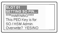 If you say [ YES ], you indicate that you have a PED Key (or set of PED Keys) from another HSM and you wish your current/new HSM to share the authentication with that other HSM. Authentication will be read from the PED Key that you present and imprinted onto the current HSM.