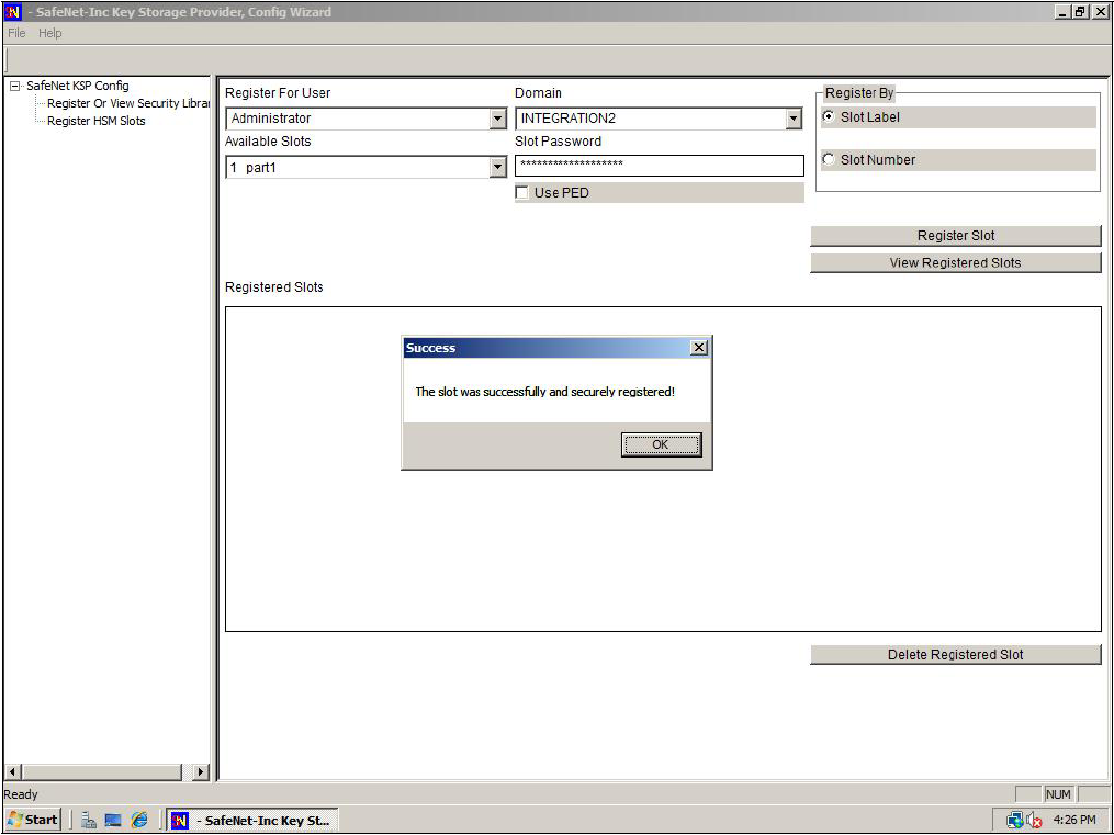 6.In the "Slot Password" field, type in the password for the indicated slot.To the right of the window, click the [Register Slot] button to register the slot for Domain/User. A success message appears.