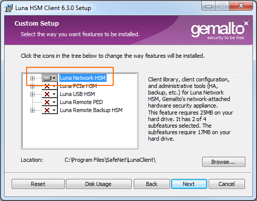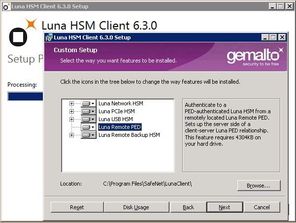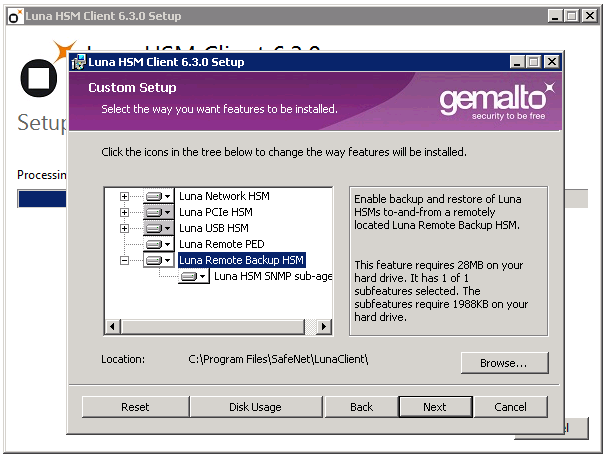 2.Install the SafeNet HSM client software on the workstation used to host your Backup HSM. Select the Remote Backup option. If the workstation is running Windows, and will be used to connect a Remote PED, install the Remote PED option here.