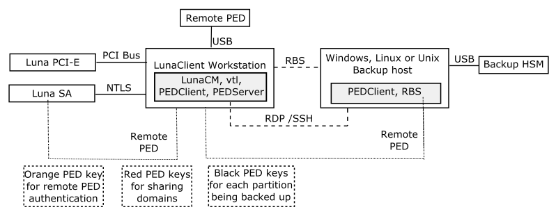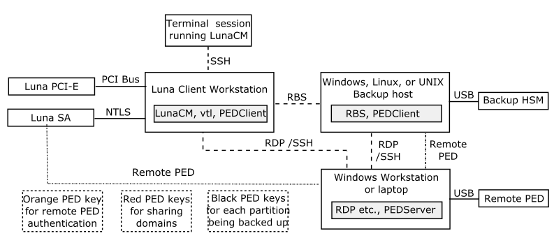 If HSMs are PED-authenticated, PEDServer is installed on the admin laptop, and a Remote-capable PED is USB-connected. RBS is required on the Backup host, because the Backup HSM is physically remote from the administrative client station, such that the RBS connection is needed for lunacm to see the Backup HSM as a slot. See the diagram Configuration for remote backup of a SafeNet HSM client workstation slot with the remote PED connected to a separate workstation .