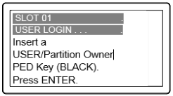 Insert the black HSM Partition Owner PED key [ of course, the unlabeled PED Key is generically black - we suggest that you apply the appropriate color sticker either immediately before or immediately after imprinting the key; before, just to ensure it gets done, or after, as a helpful indicator as to which ones are imprinted (with which secret), and which ones still blank ] and press [Enter]. A unique