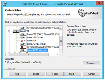 7.Click to select any of the SafeNet Product software options that you wish to install. Any that are marked with a red "X" are currently de-selected and will not be installed when you proceed. You must accept at least the major feature for your HSM. You can select all, if you wish - there is no conflict.