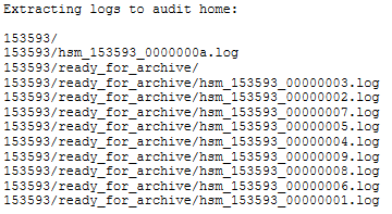 [mylunasa] lunash:>audit log untarlogs -file x.tgz Cannot find the file in /home/audit/lush_files/ Found files: 153593.lws audit-153593.tgz Command Result : 65535 (Luna Shell execution) [mylunasa] lunash:>audit log untarlogs -file audit-153593.tgzTo verify these logs see the 'audit secret import' command to import the HSM's log secret. Command Result : 0 (Success)