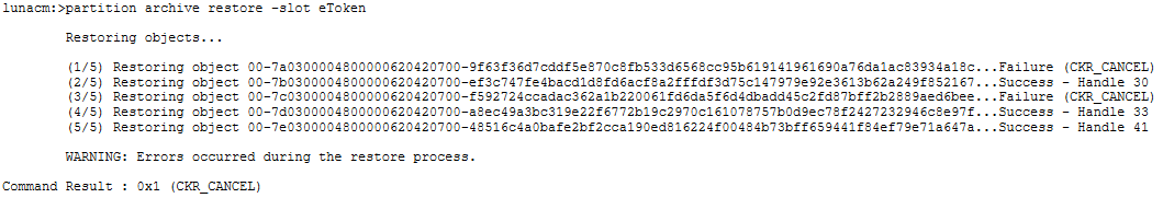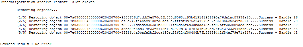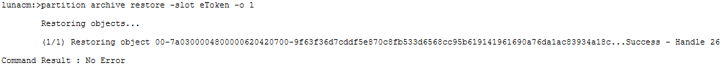 lunacm:> partition archive restore -slot 6 -password <somepassword> -partition mybackupPar Logging in to partition mybackupPar on slot 6 as the user. Verifying that all objects can be restored... 1 object will be restored. Restoring objects... Cloned object 50 from partition mybackupPar (new handle 39). Restore Complete. 1 objects have been restored from partition mybackupPar on slot 6. Command Result : No Error