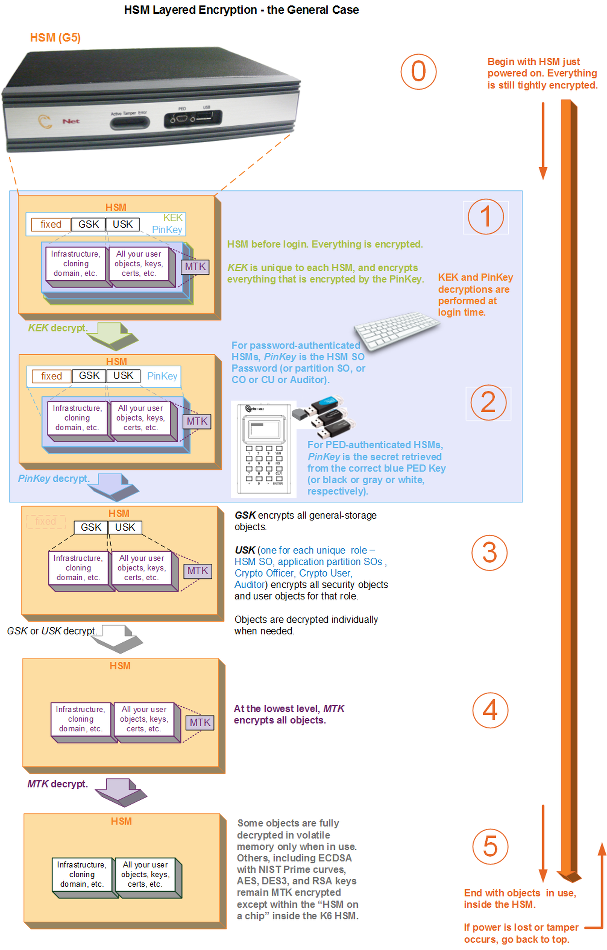 The general authentication model applies to both Password Authenticated and PED Authenticated SafeNet HSMs. SafeNet HSMs do not keep any objects in the clear. All objects are encrypted by multiple layers, and are fully decrypted in temporary (volatile) memory only while needed.