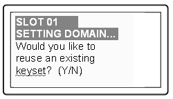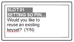 5.Luna PED asks: "Do you wish to reuse an existing keyset?". If the answer is No, the HSM creates a new secret which will reside on both the HSM and the key (or keys) that is (or are) about to be imprinted. If the answer is Yes, then the HSM does not create a new secret and instead waits for one to be presented via the PED.